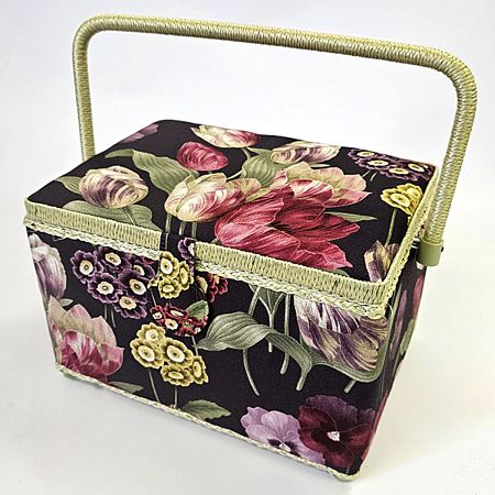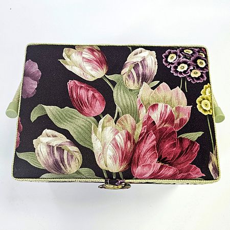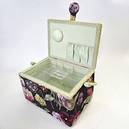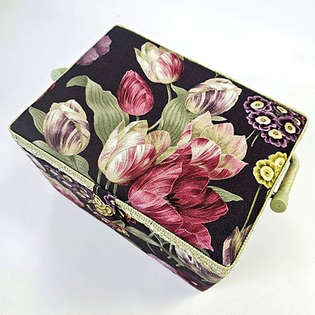 Шкатулка обтянута тканью из 100% хлопка, имеет плетеную ручку для переноски и оплетку по периметру крышки. Внутри шкатулки на крышке закреплена подушечка для хранения игл, а также имеется внутренний контейнер из пластика с отделениями для хранения мелких аксессуаров.