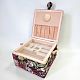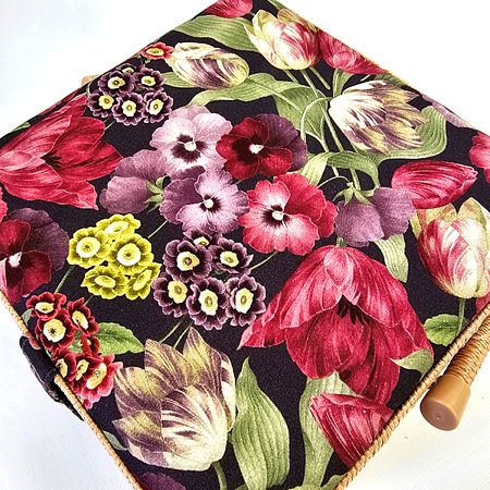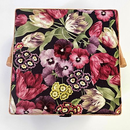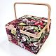 Шкатулка обтянута тканью из 100% хлопка, имеет плетеную ручку для переноски и оплетку по периметру крышки. Внутри шкатулки на крышке закреплена подушечка для хранения игл, а также имеется внутренний контейнер из пластика с отделениями для хранения мелких аксессуаров.