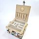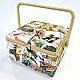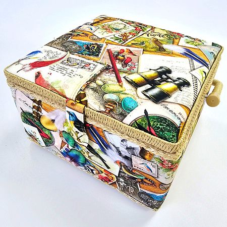 Шкатулка обтянута тканью из 100% хлопка, имеет плетеную ручку для переноски и оплетку по периметру крышки. Внутри шкатулки на крышке закреплена подушечка для хранения игл, а также имеется внутренний контейнер из пластика с отделениями для хранения мелких аксессуаров.