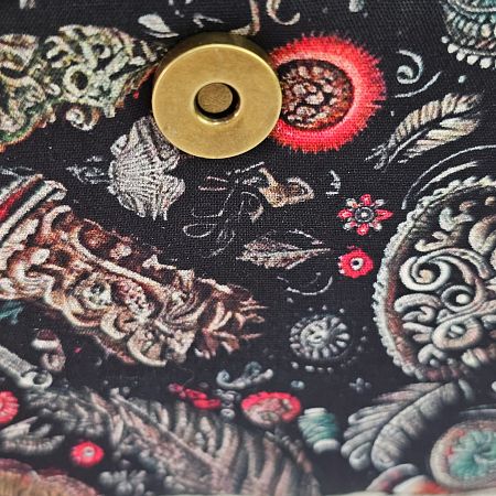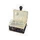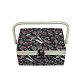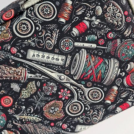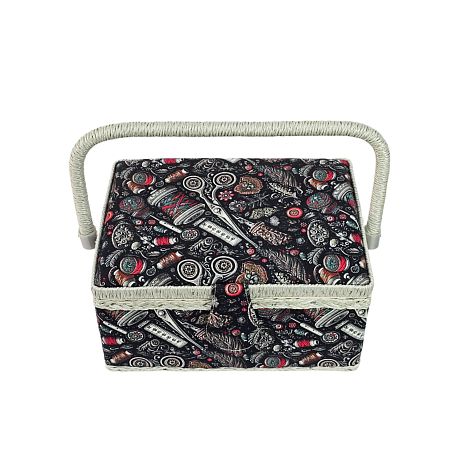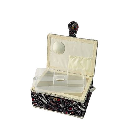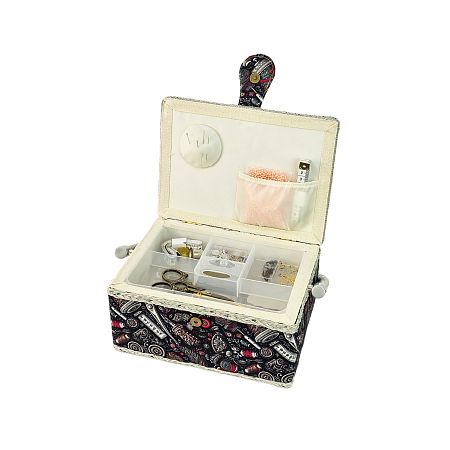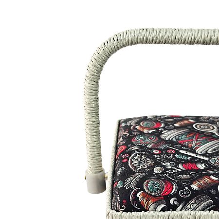Шкатулка обтянута тканью из 100% хлопка, имеет плетеную ручку для переноски и оплетку по периметру крышки. Внутри шкатулки на крышке закреплена подушечка для хранения игл, а также имеется внутренний контейнер из пластика с отделениями для хранения мелких аксессуаров.