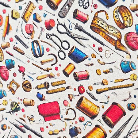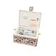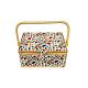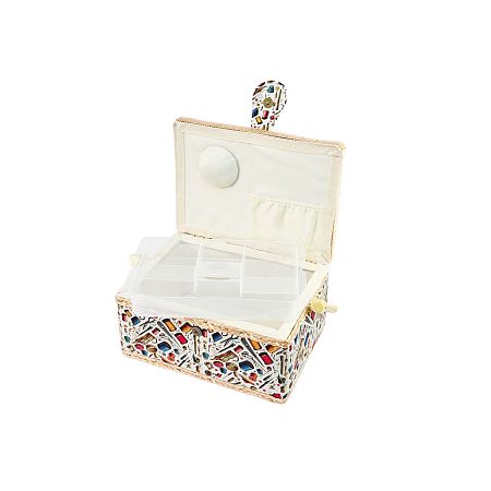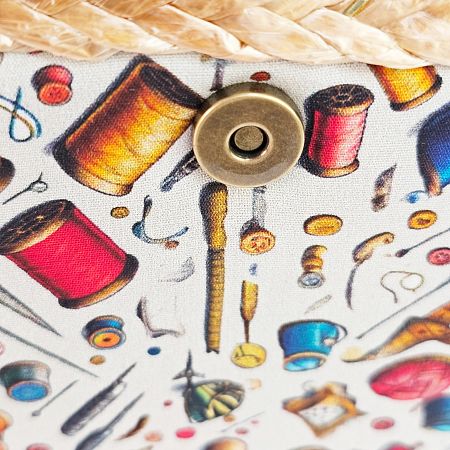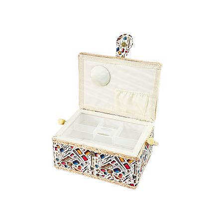 Шкатулка обтянута тканью из 100% хлопка, имеет плетеную ручку для переноски и оплетку по периметру крышки. Внутри шкатулки на крышке закреплена подушечка для хранения игл, а также имеется внутренний контейнер из пластика с отделениями для хранения мелких аксессуаров.