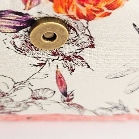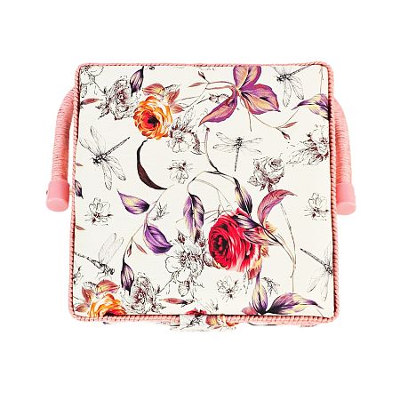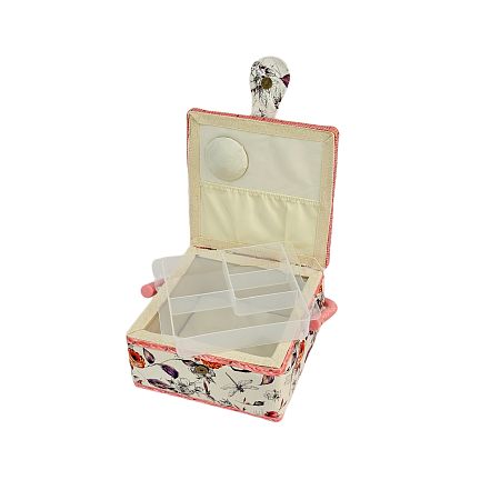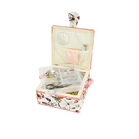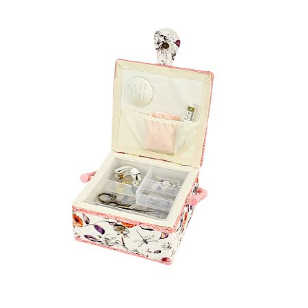 Шкатулка обтянута тканью из 100% хлопка, имеет плетеную ручку для переноски и оплетку по периметру крышки. Внутри шкатулки на крышке закреплена подушечка для хранения игл, а также имеется внутренний контейнер из пластика с отделениями для хранения мелких аксессуаров.