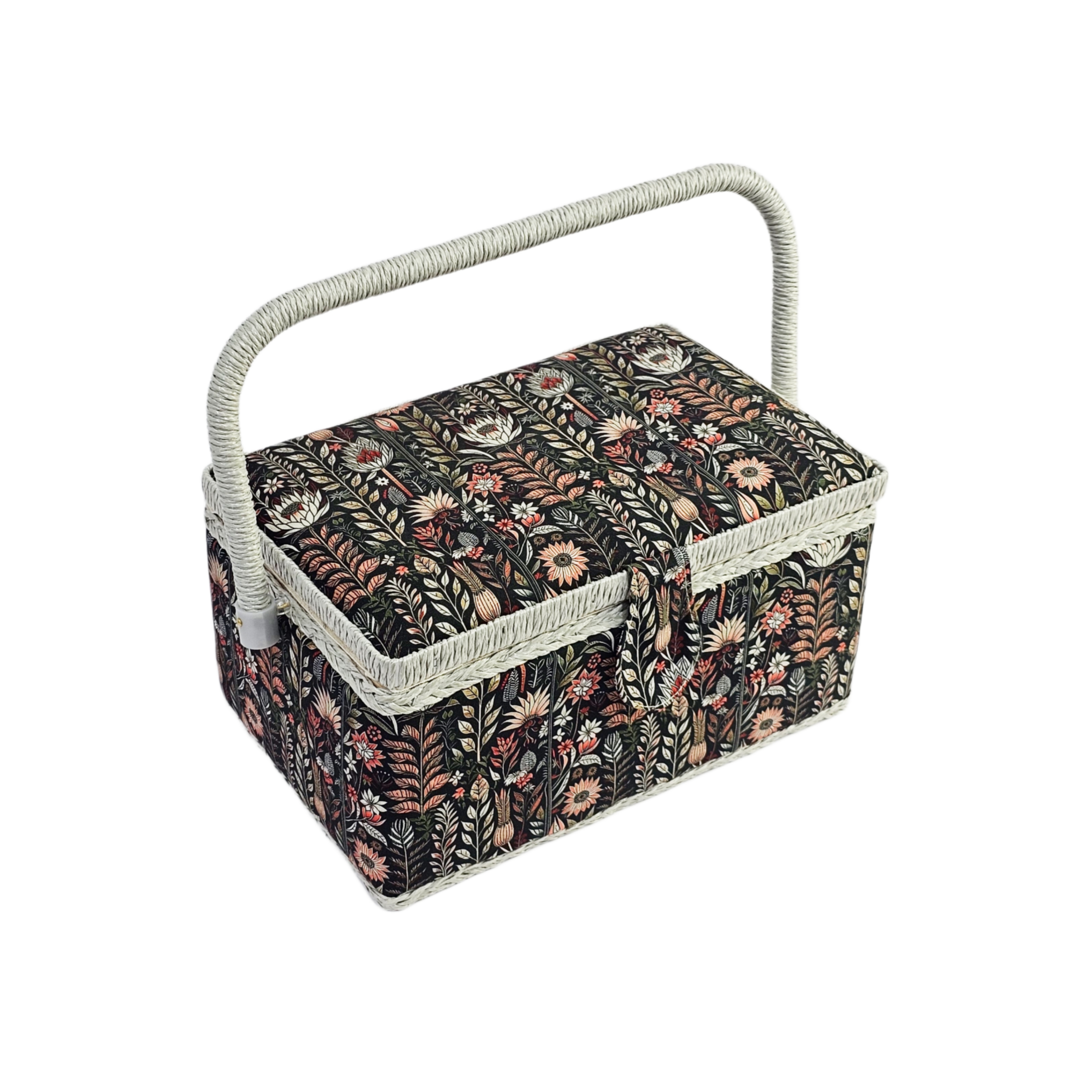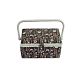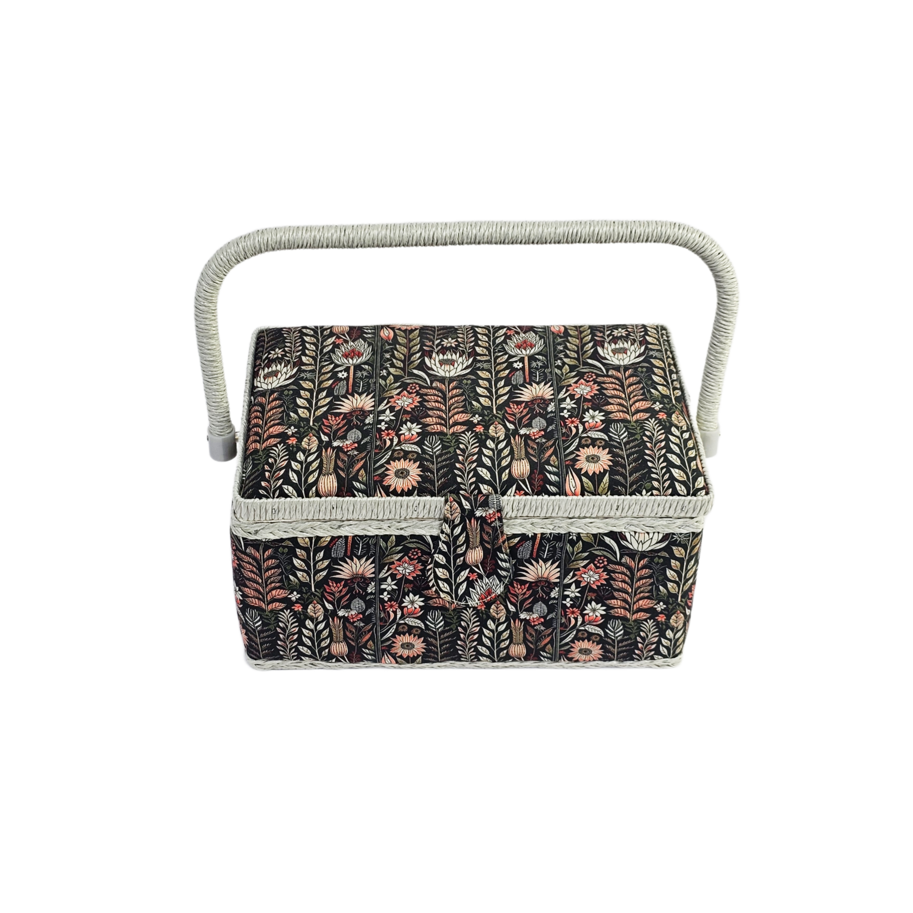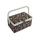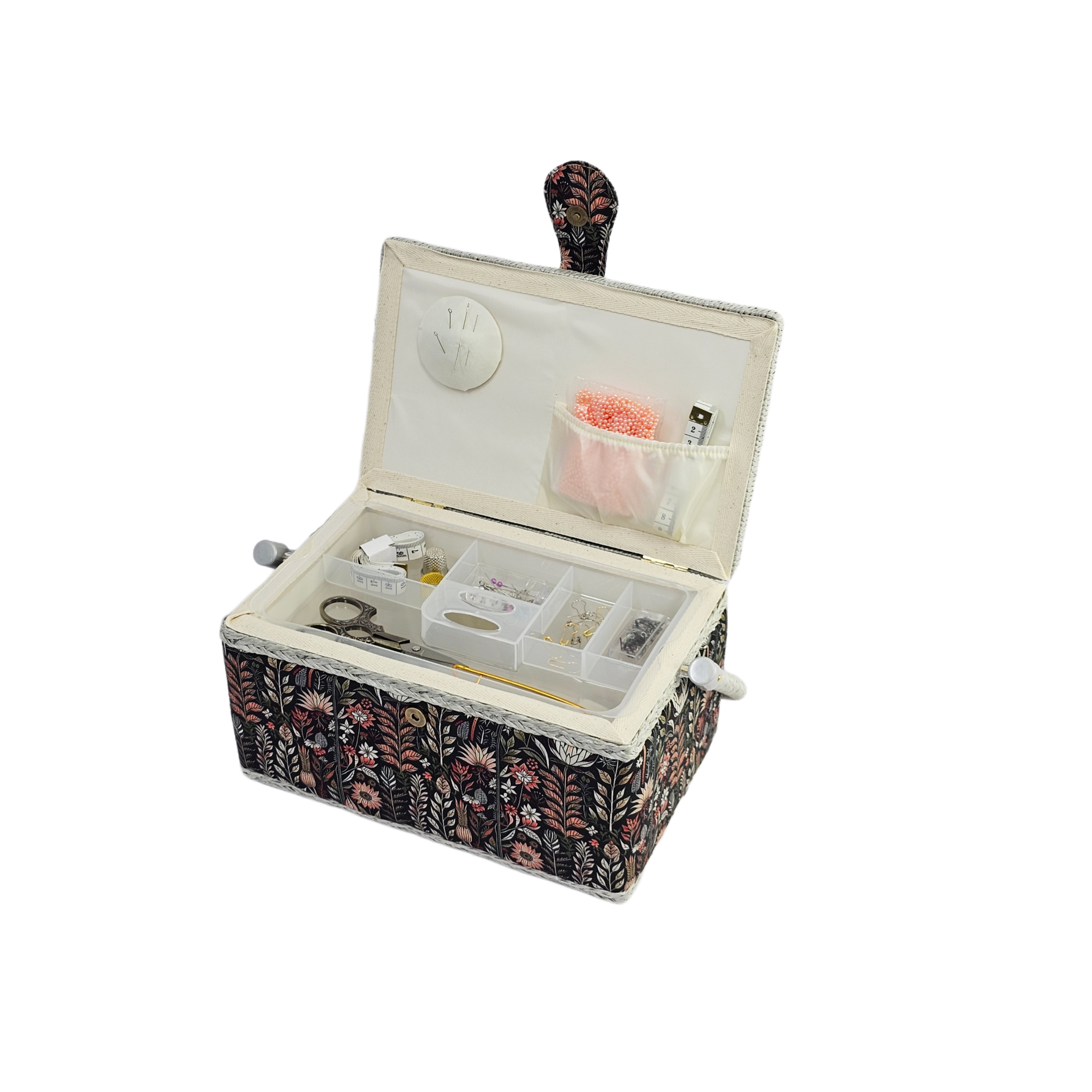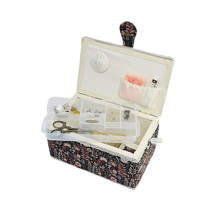 Шкатулка обтянута тканью из 100% хлопка, имеет плетеную ручку для переноски и оплетку по периметру крышки. Внутри шкатулки на крышке закреплена подушечка для хранения игл, а также имеется внутренний контейнер из пластика с отделениями для хранения мелких аксессуаров.