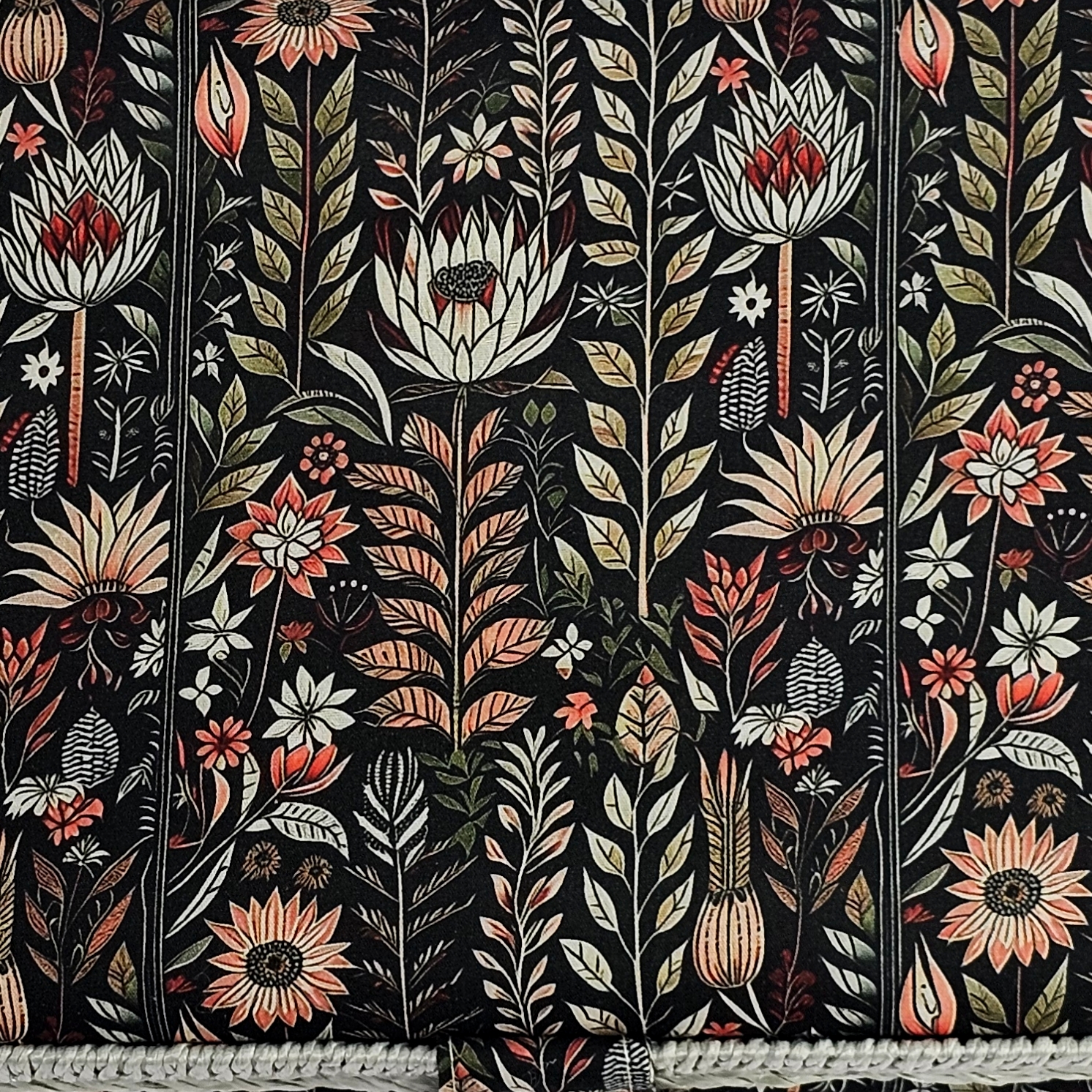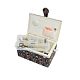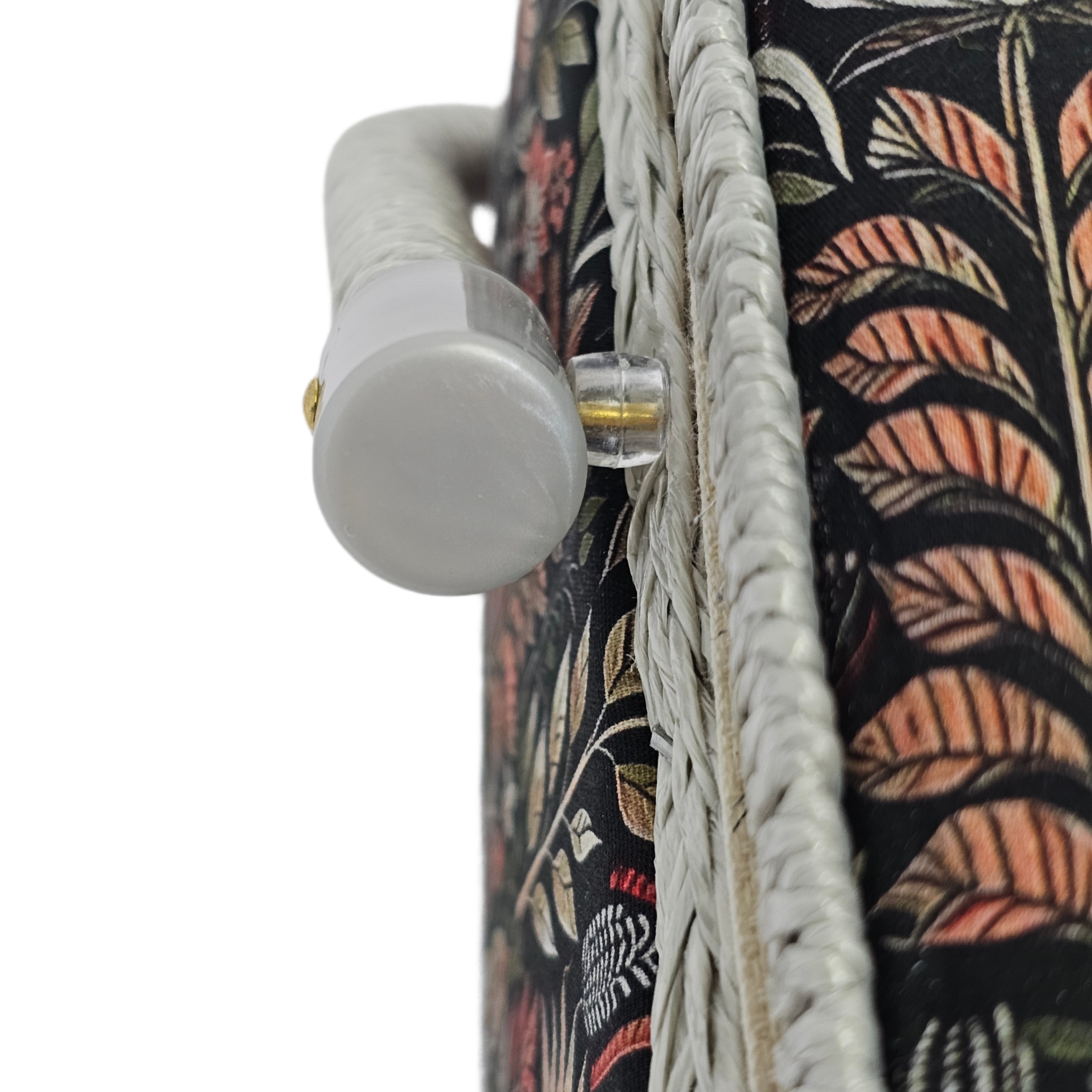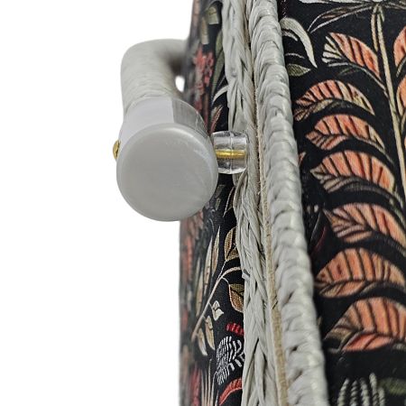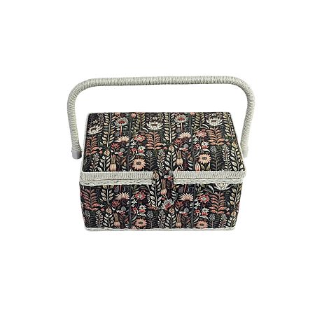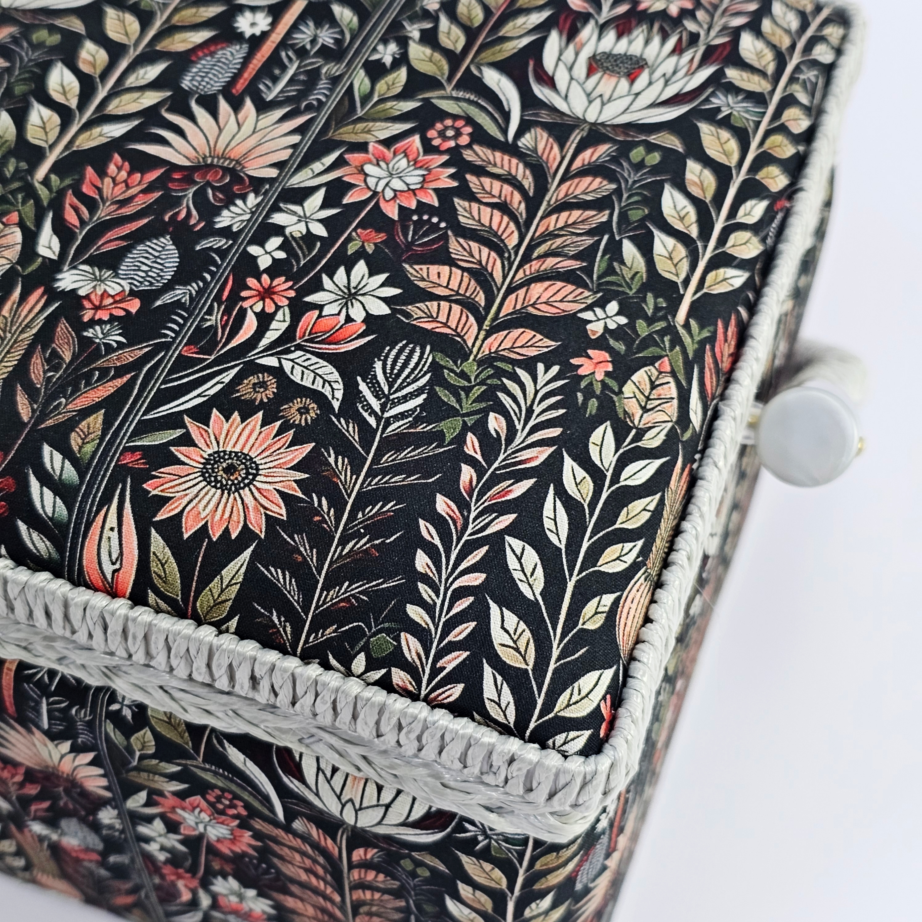 Шкатулка обтянута тканью из 100% хлопка, имеет плетеную ручку для переноски и оплетку по периметру крышки. Внутри шкатулки на крышке закреплена подушечка для хранения игл, а также имеется внутренний контейнер из пластика с отделениями для хранения мелких аксессуаров.