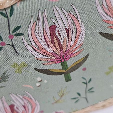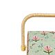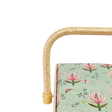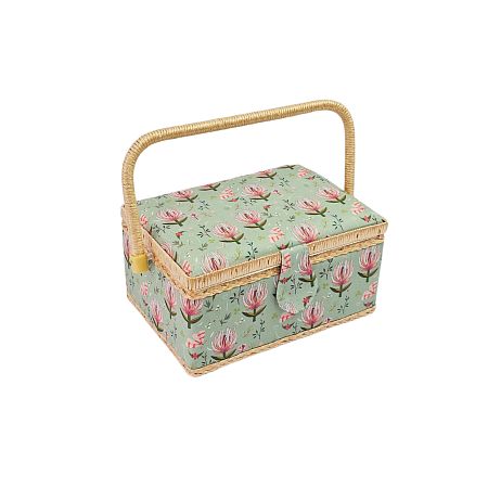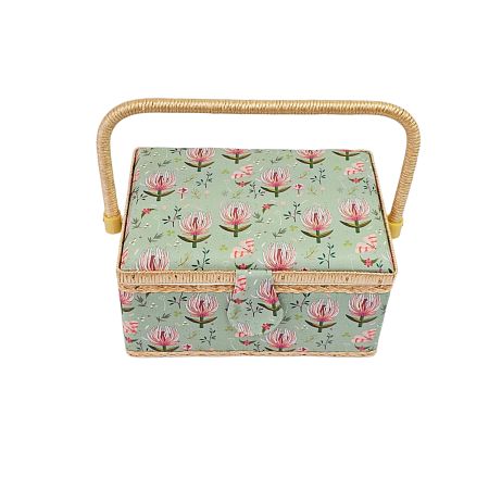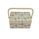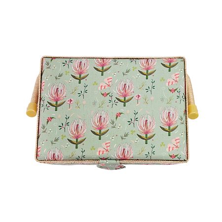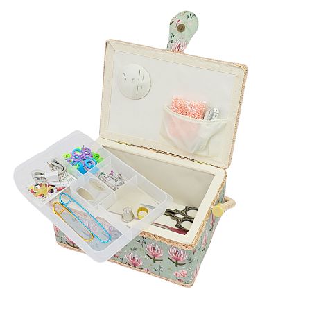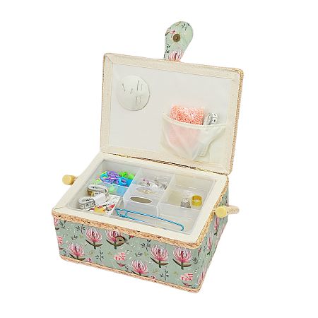 Шкатулка обтянута тканью из 100% хлопка, имеет плетеную ручку для переноски и оплетку по периметру крышки. Внутри шкатулки на крышке закреплена подушечка для хранения игл, а также имеется внутренний контейнер из пластика с отделениями для хранения мелких аксессуаров.