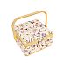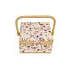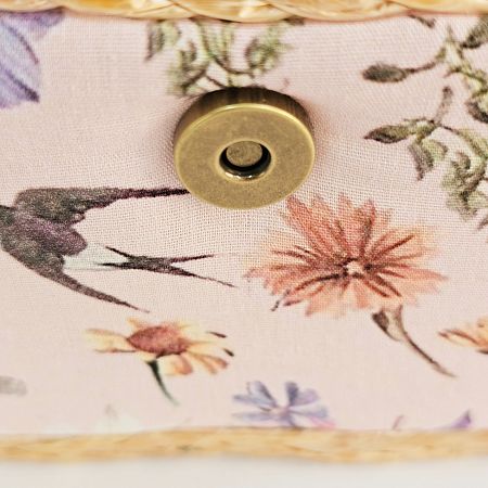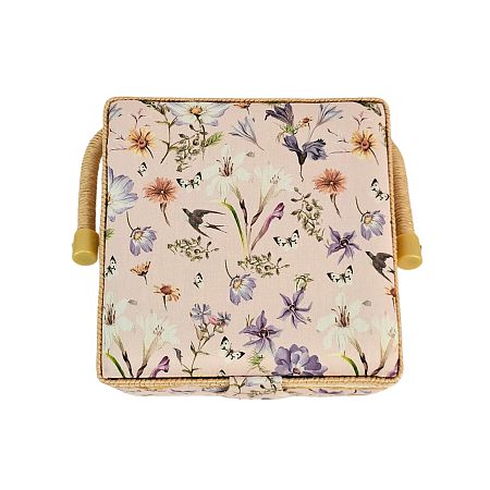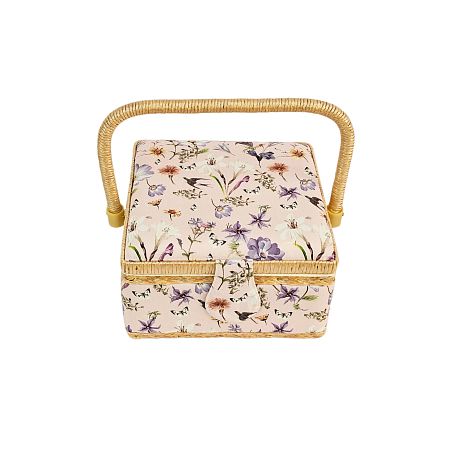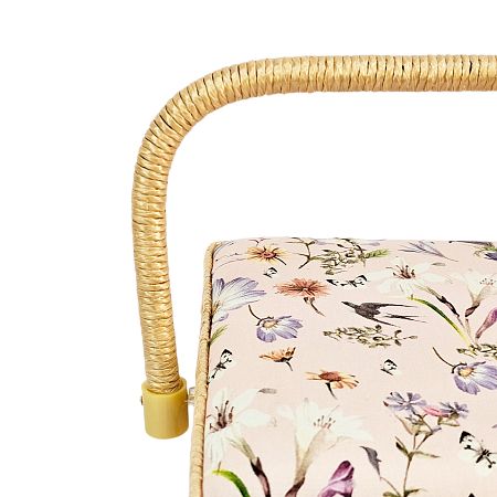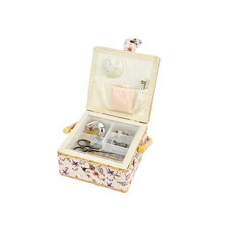 Шкатулка обтянута тканью из 100% хлопка, имеет плетеную ручку для переноски и оплетку по периметру крышки. Внутри шкатулки на крышке закреплена подушечка для хранения игл, а также имеется внутренний контейнер из пластика с отделениями для хранения мелких аксессуаров.
