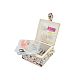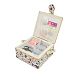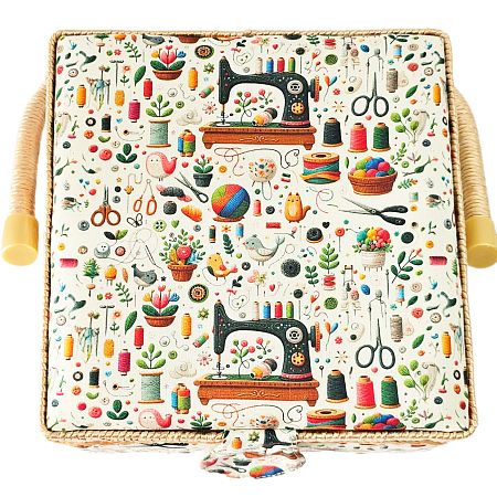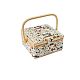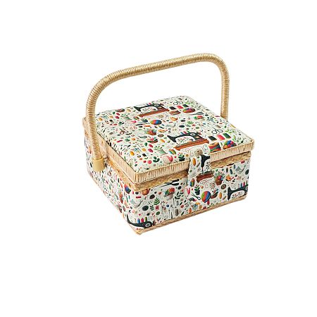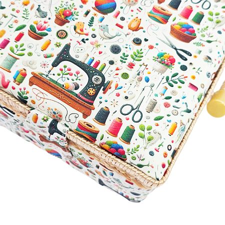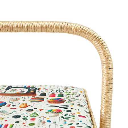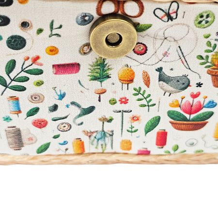 Шкатулка обтянута тканью из 100% хлопка, имеет плетеную ручку для переноски и оплетку по периметру крышки. Внутри шкатулки на крышке закреплена подушечка для хранения игл, а также имеется внутренний контейнер из пластика с отделениями для хранения мелких аксессуаров.