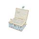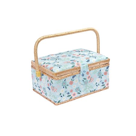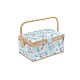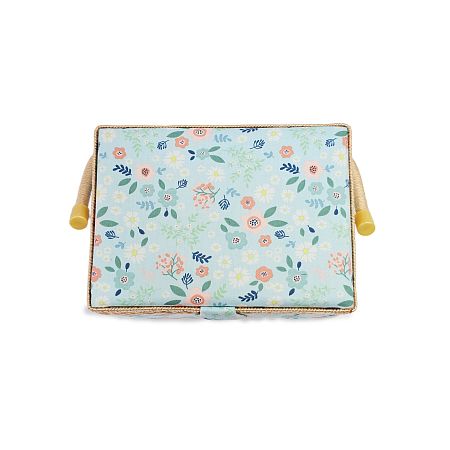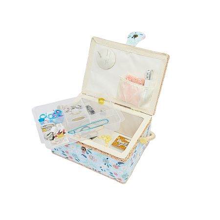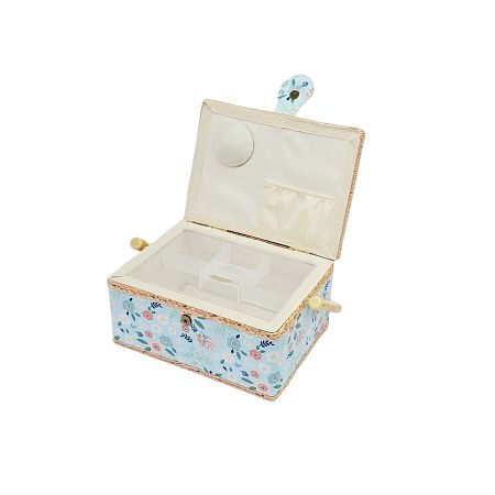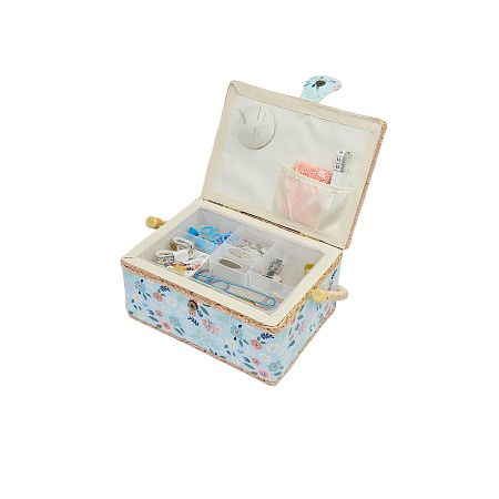 Шкатулка обтянута тканью из 100% хлопка, имеет плетеную ручку для переноски и оплетку по периметру крышки. Внутри шкатулки на крышке закреплена подушечка для хранения игл, а также имеется внутренний контейнер из пластика с отделениями для хранения мелких аксессуаров.
