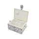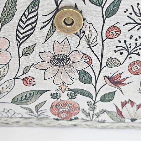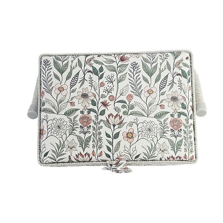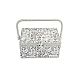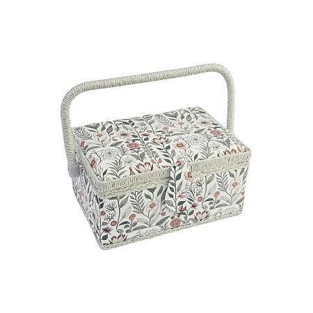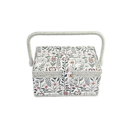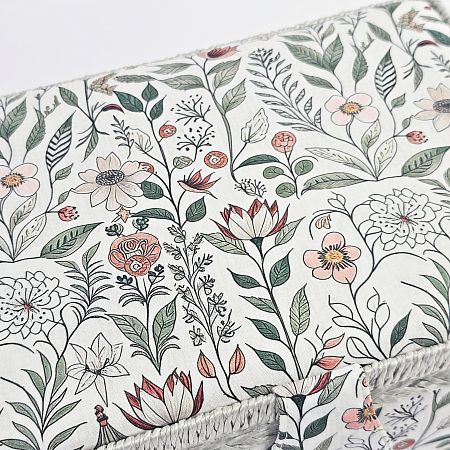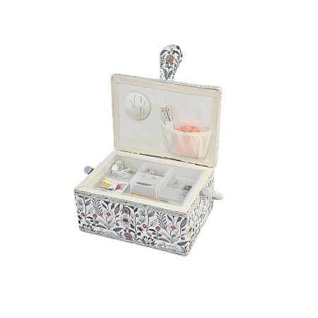 Шкатулка обтянута тканью из 100% хлопка, имеет плетеную ручку для переноски и оплетку по периметру крышки. Внутри шкатулки на крышке закреплена подушечка для хранения игл, а также имеется внутренний контейнер из пластика с отделениями для хранения мелких аксессуаров.