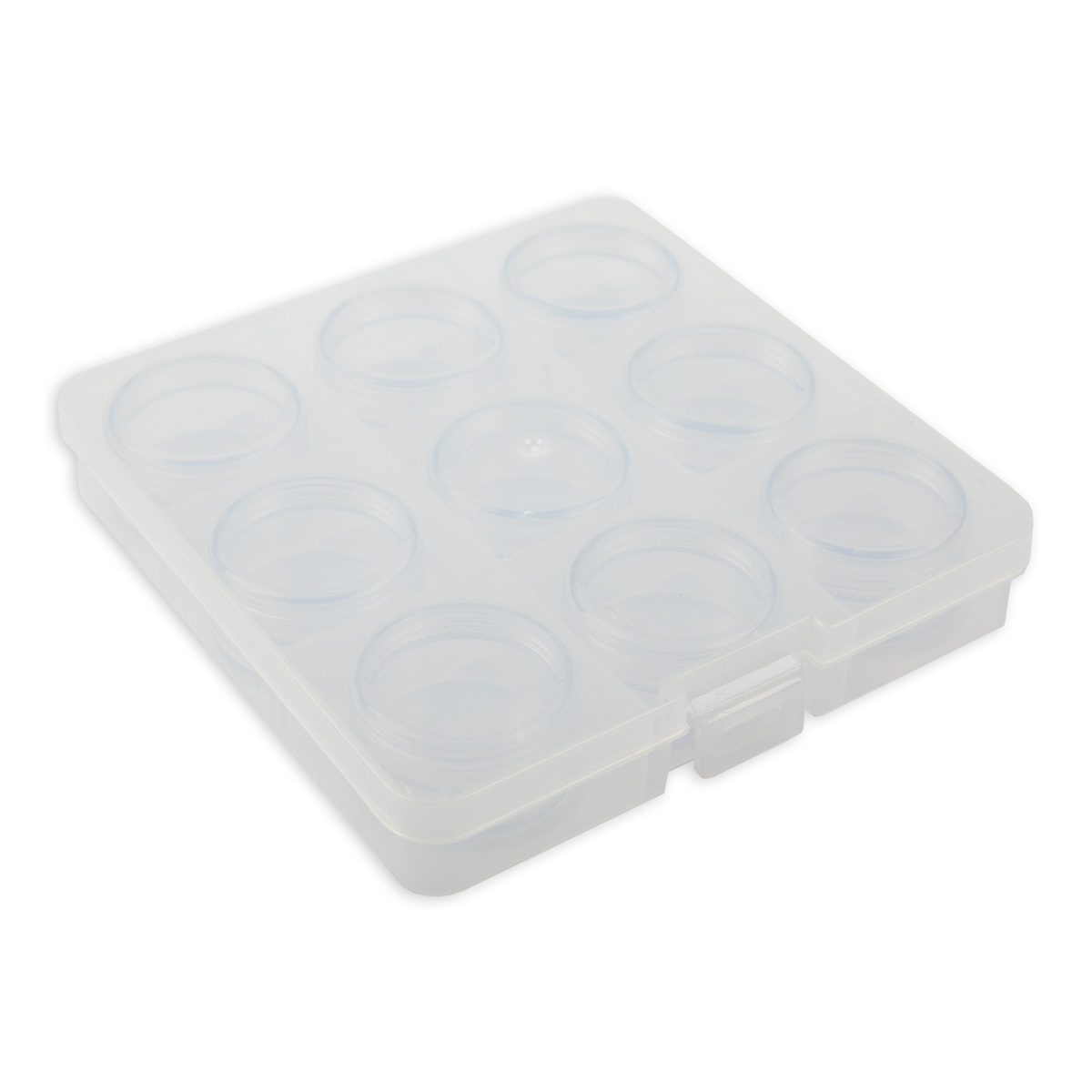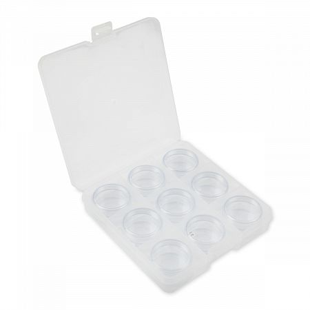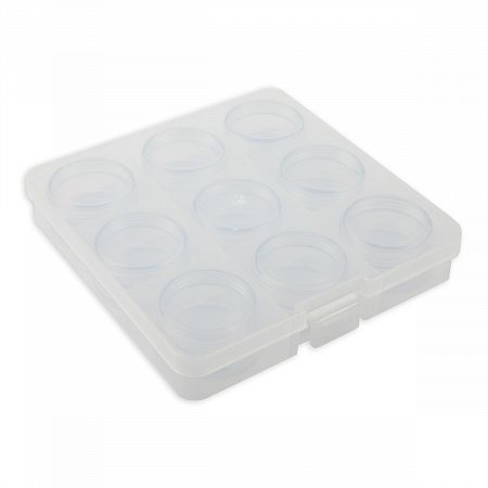 Пластиковая коробка с 9 ячейками и 9 тубами с закручивающимися крышками. Размер: 13.5х13.7х2.3 см.