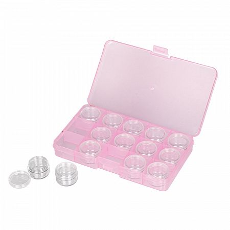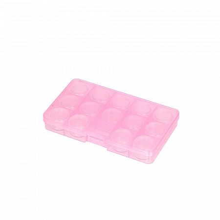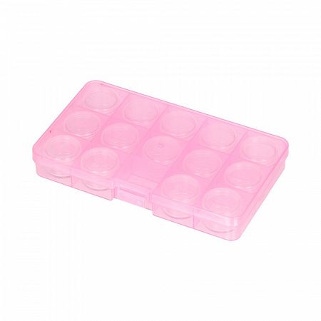Пластиковая коробка с 15 ячейками и 14 тубами с закручивающимися крышками. Размер: 17.7х10.2х2.3 см.