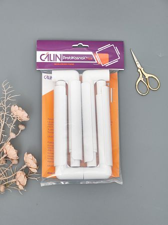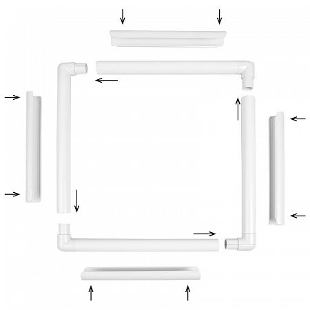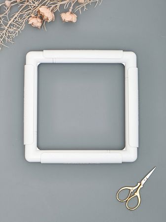 Сборные пяльцы-рамка 20х20 см и четыре зажима белого цвета.