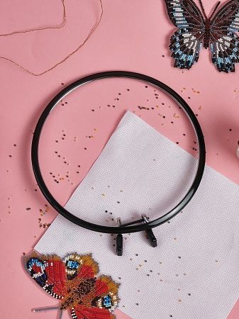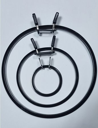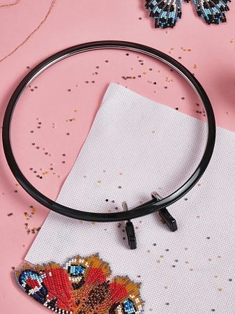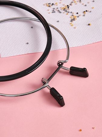 Внешняя часть пялец изготовлена из пластика, а внутренняя из твердого металла с хромированной пружиной. Стяжной хомут легко зажимает ткань. Пяльцы очень удобны и практичны в использовании.