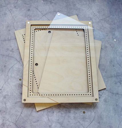 Три детали: деталь А (основание рамки), деталь В (основа для вышивки) и деталь С (верхняя накладная рамка) и крышка из прозрачного акрила с магнитами.