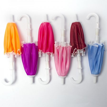 Набор из 6 разноцветных зонтиков для кукол. Материал - полиэтилен и пластмасса, длина зонтика - 16 см.