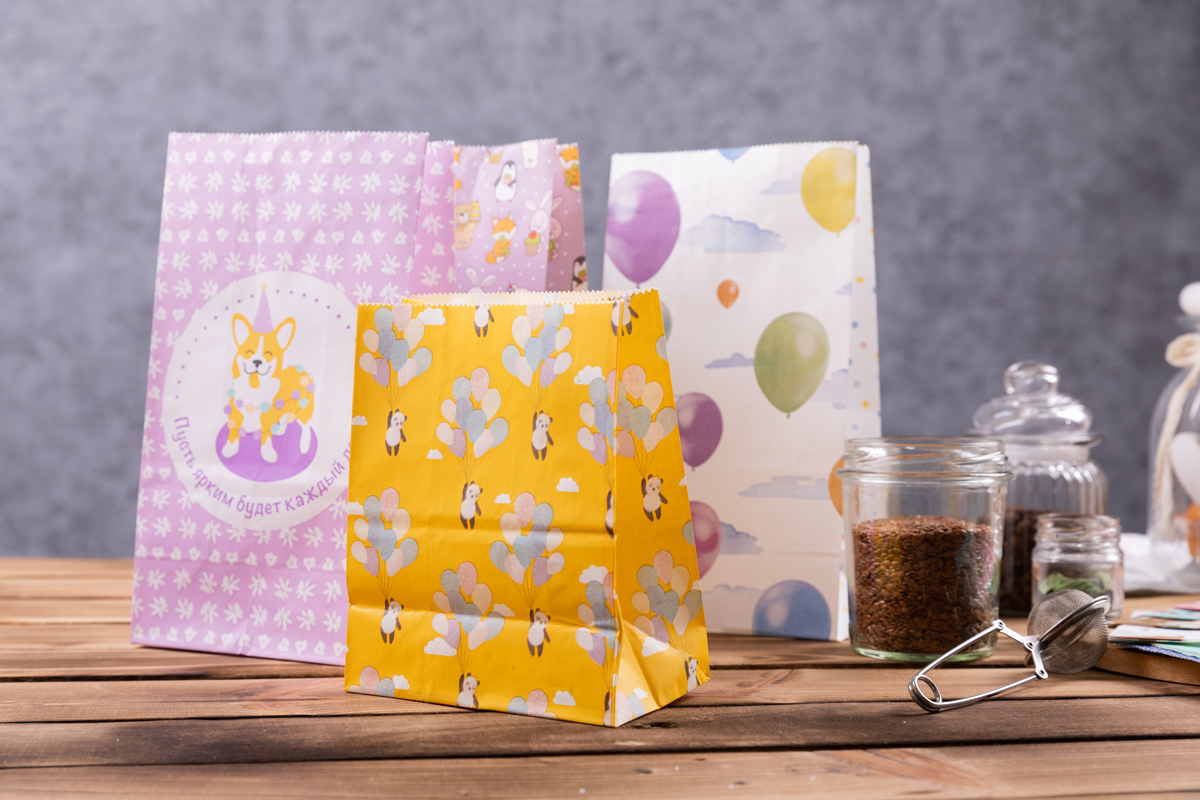 3 крафт-пакета из плотной бумаги, украшенные эксклюзивным дизайном.