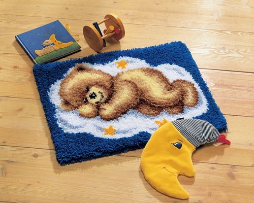 канва-страмин с нанесённым цветным рисунком, схема, нитки, крючок для ковровой вышивки, инструкция на русском языке.