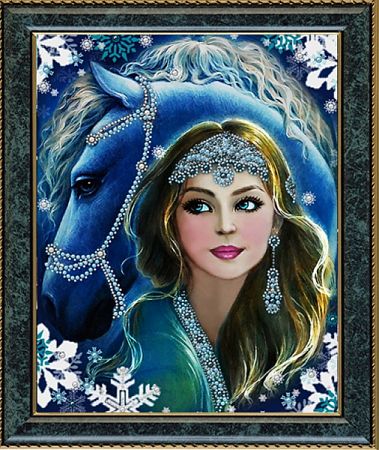 Набор для вышивки «Красавица» от RK Larkes вышивается бисером и бусинами по нанесённому рисунку. Бисером декорируются элементы одежды, серьги и головной убор девушки, а также сбруя лошади.