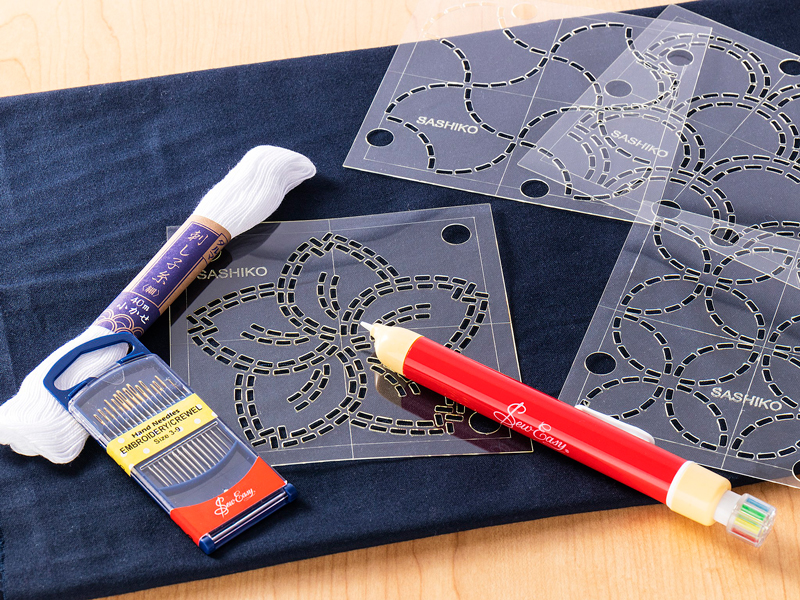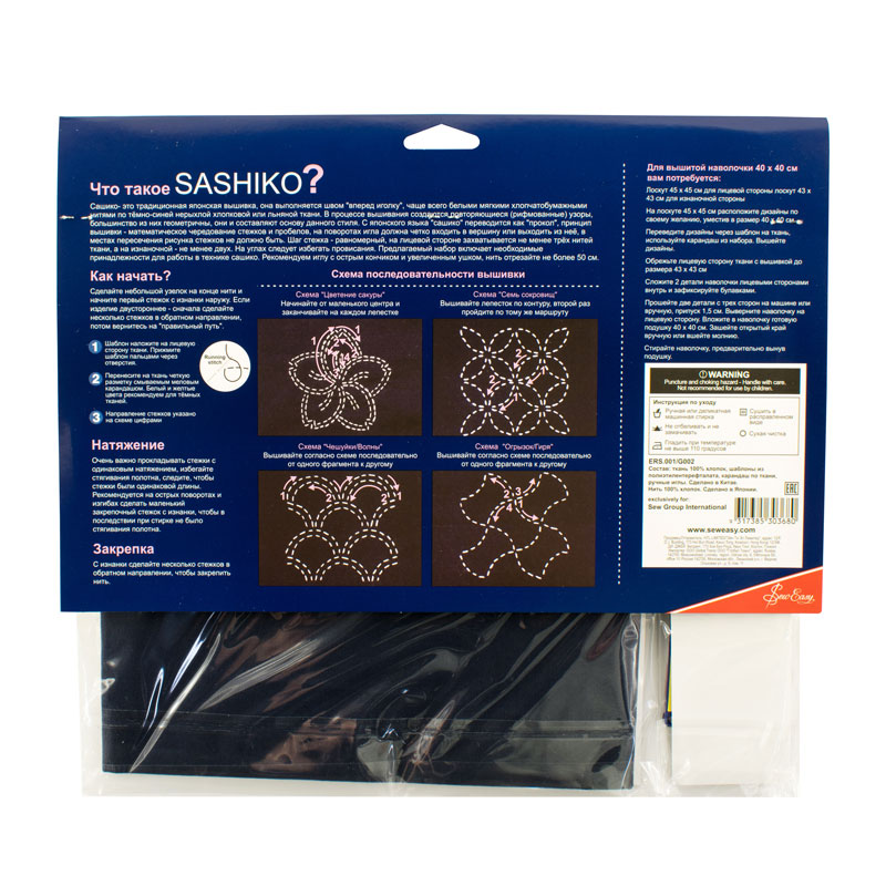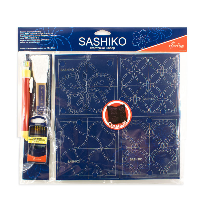 Лоскут ткани темно-синего цвета из натурального хлопка размером 50x142 см, 4 шаблона с классическими дизайнами размером 4х4 дюйма каждый, нить для вышивки толщиной 20/4 в мотке 40 м, карандаш для ткани с выдвижными меловыми грифелями разных цветов (для сашико по синей ткани рекомендуем делать белую или желтую разметку), набор вышивальных игл №3-9, инструкция на русском языке на упаковке.