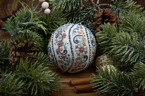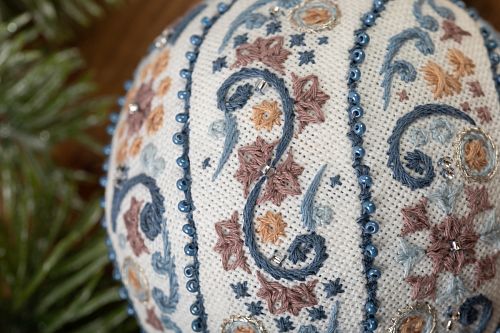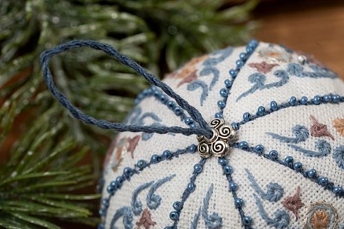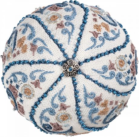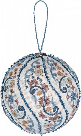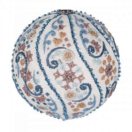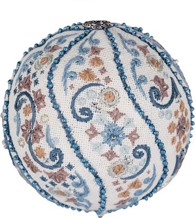 Канва, мулине, металлизированные нити, бисер - 2 цвета, синтепон для набивки шара, фурнитура для оформления шара, схема, инструкция по вышиванию и сшиванию игрушки.