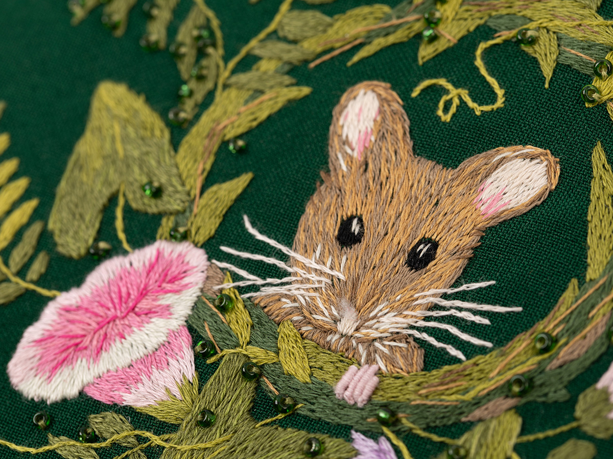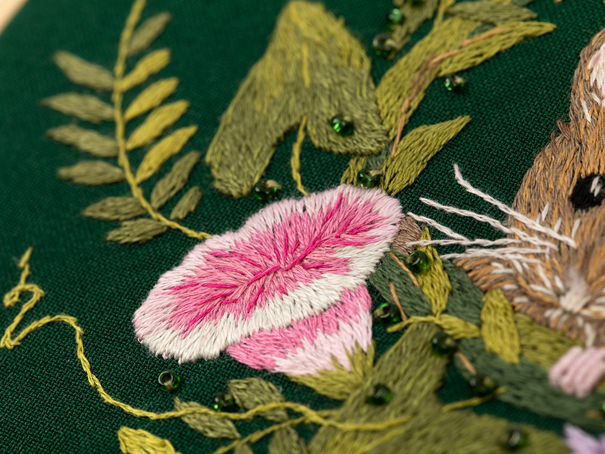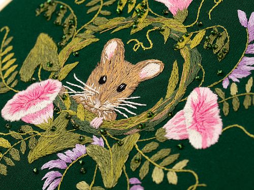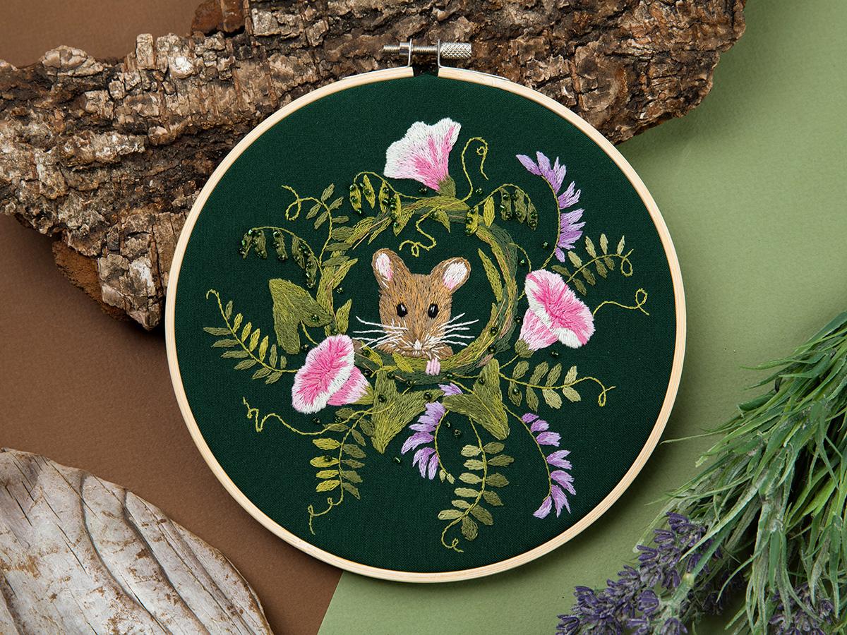 Хлопковая ткань, водорастворимый флизелин с напечатанным контуром, мулине, бисер - 1 цвет, деревянные пяльцы, игла, подробная инструкция по вышиванию с цветными иллюстрациями.