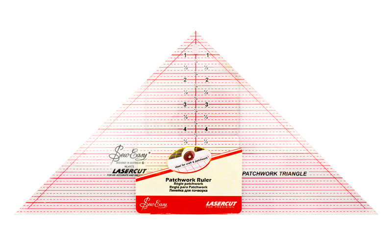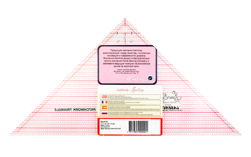 Идеально подходит для раскроя треугольных блоков с стороной до 10 дюймов. Основной инструмент для дизайнов, где блоки привязываются к одной начальной точке. Используется для кроя треугольников с углом 90° из полос, что экономит материал. Разметка 1/2", 1/4", 1/8" припуски по краям 1/4".
