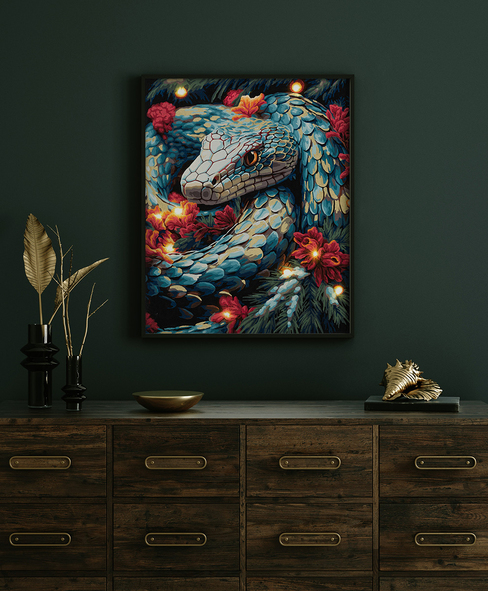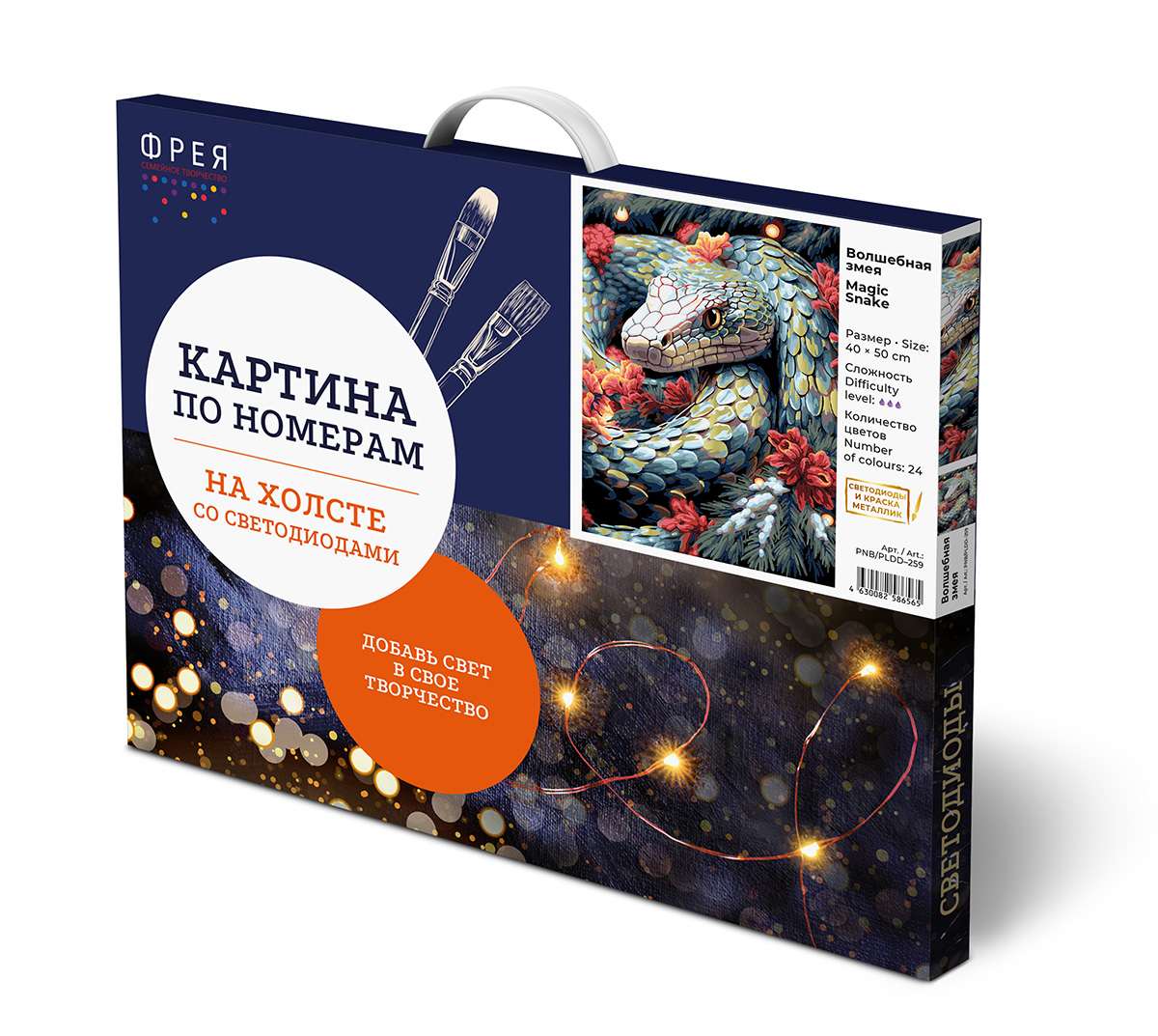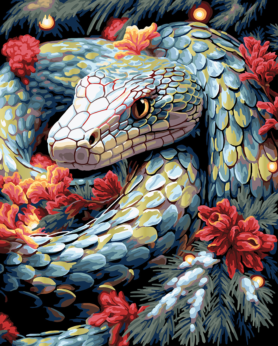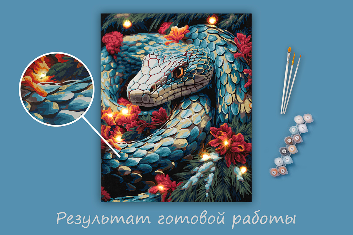 Холст с нанесенным рисунком на подрамнике, акриловые краски в пронумерованных баночках, 3 кисти разного размера, светодиодная гирлянда, контрольный лист с нанесенной схемой, крепление для подвешивания картины на стену, эталон готовой картины с инструкцией.