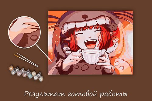 Картонная основа с напечатанным изображением, акриловые краски в пронумерованных баночках, две кисти разного размера, инструкция с контрольным листом и эталоном готовой картины.