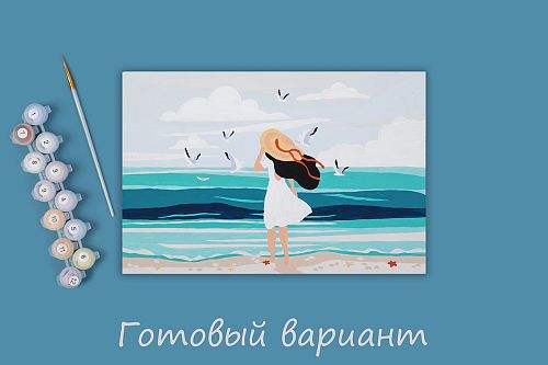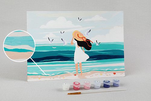 Картонная основа с напечатанным изображением, акриловые краски в пронумерованных баночках, две кисти разного размера, инструкция с контрольным листом и эталоном готовой картины.
