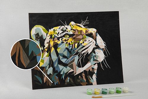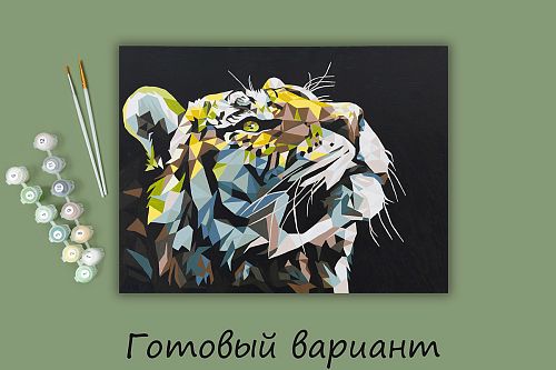 Картонная основа с напечатанным изображением, акриловые краски в пронумерованных баночках, две кисти разного размера, инструкция с контрольным листом и эталоном готовой картины.