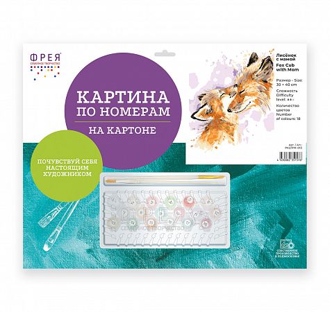 Картонная основа с напечатанным изображением, акриловые краски в пронумерованных баночках, две кисти разного размера, инструкция с контрольным листом и эталоном готовой картины.