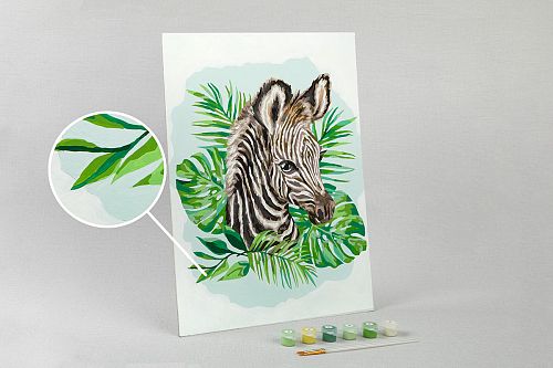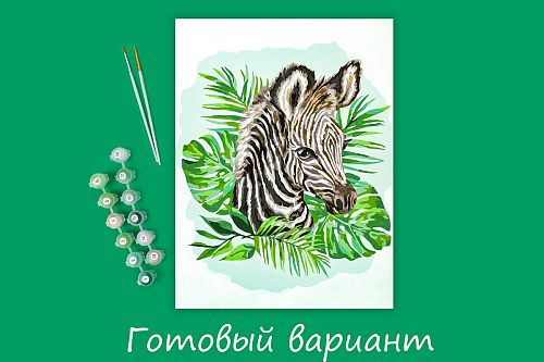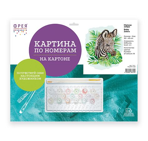 Картонная основа с напечатанным изображением, акриловые краски в пронумерованных баночках, две кисти разного размера, инструкция с контрольным листом и эталоном готовой картины.