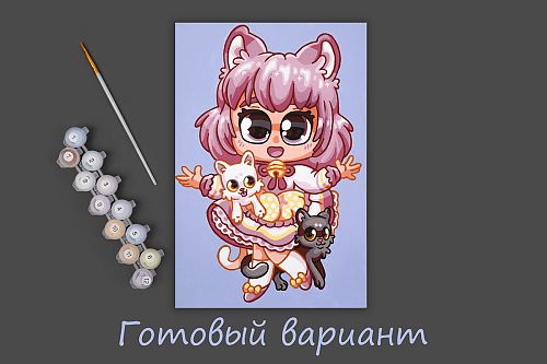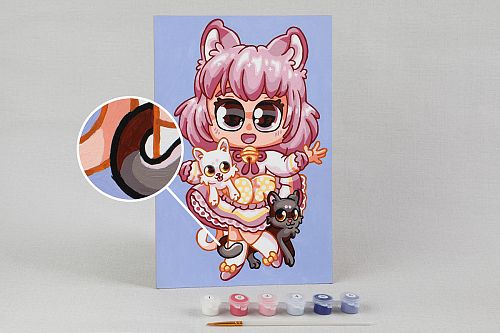 Картонная основа с напечатанным изображением, акриловые краски в пронумерованных баночках, две кисти разного размера, инструкция с контрольным листом и эталоном готовой картины.