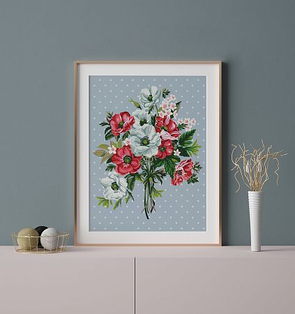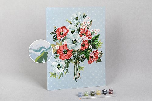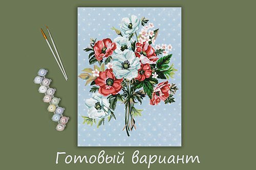 Картонная основа с напечатанным изображением, акриловые краски в пронумерованных баночках, две кисти разного размера, инструкция с контрольным листом и эталоном готовой картины.