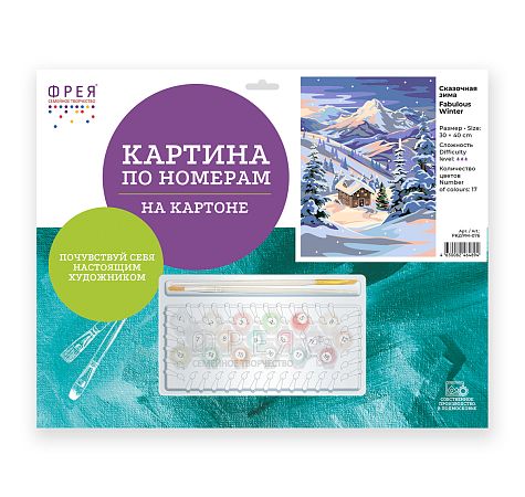 Картонная основа с напечатанным изображением, акриловые краски в пронумерованных баночках, две кисти разного размера, инструкция с контрольным листом и эталоном готовой картины.