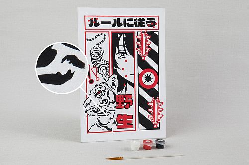 Картонная основа с напечатанным изображением, акриловые краски в пронумерованных баночках, две кисти разного размера, инструкция с контрольным листом и эталоном готовой картины.