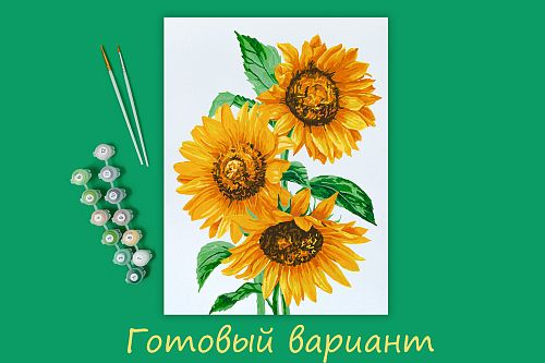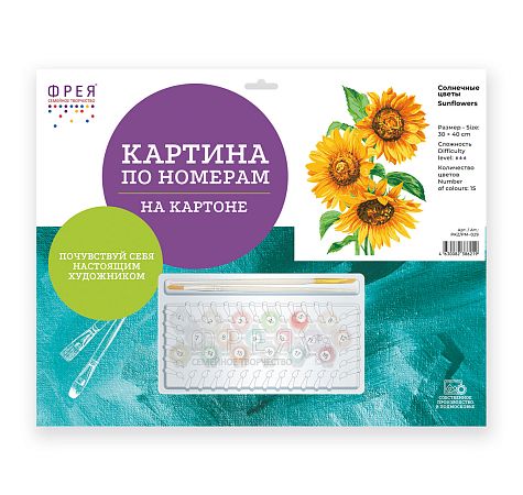 Картонная основа с напечатанным изображением, акриловые краски в пронумерованных баночках, две кисти разного размера, инструкция с контрольным листом и эталоном готовой картины.