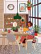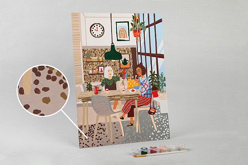 Картонная основа с напечатанным изображением, акриловые краски в пронумерованных баночках, две кисти разного размера, инструкция с контрольным листом и эталоном готовой картины.