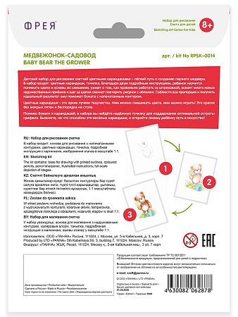 Основа для рисования (бумага) с напечатанными контурами, цветные карандаши, точилка, подробная инструкция с картинками, изображения этапов в масштабе 1:1.