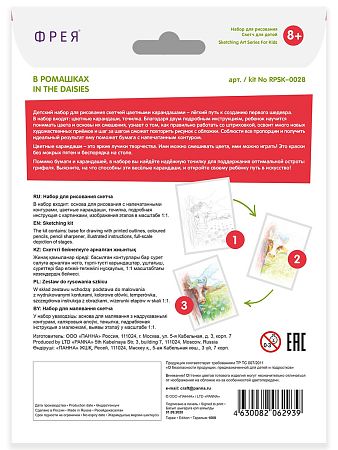 Основа для рисования (бумага) с напечатанными контурами, цветные карандаши, точилка, подробная инструкция с картинками, изображения этапов в масштабе 1:1.