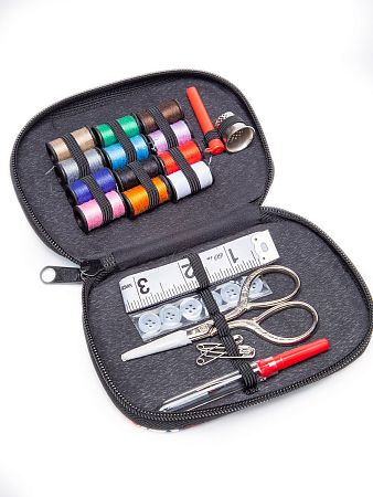 Набор включает все необходимое для быстрого ремонта и шитья. Такой набор необходим в любом доме, а также его удобно взять с собой в дорогу. В набор входит: сантиметр, ножницы, пуговицы в упаковке (5 шт), булавки английские (3 шт), вспарыватель швов, наперсток, швейные иглы (6 шт), нитки швейные в катушках (12 цветов)
