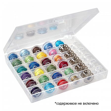 Пластиковый органайзер с откидной крышкой 15х13х2.6 см. Вмещает до 36 пластиковых или металлических катушек. Больше никаких запутанных нитей. Изготовлен из прочного пластика с прочными передними защелками закрытия.