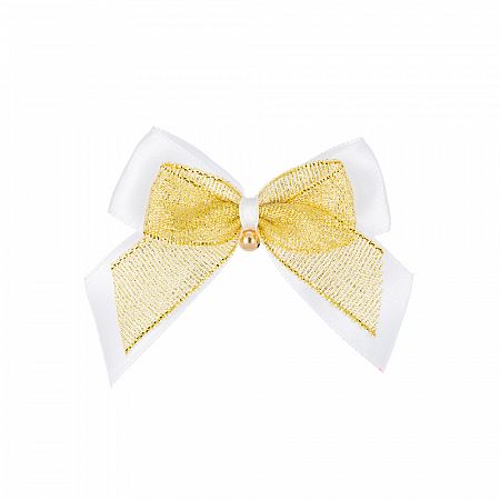 Симпатичный двойной бантик с бусинкой. Изготовлен из атласной ленты и металлизированной ткани. Подойдет для различных видов декора. И как отделочный элемент для одежды или сумок, ободка для волос, резинок, заколок, детской бижутерии. Также может быть использован в украшении букетов, венков, свадебных композиций, новогодних елок.