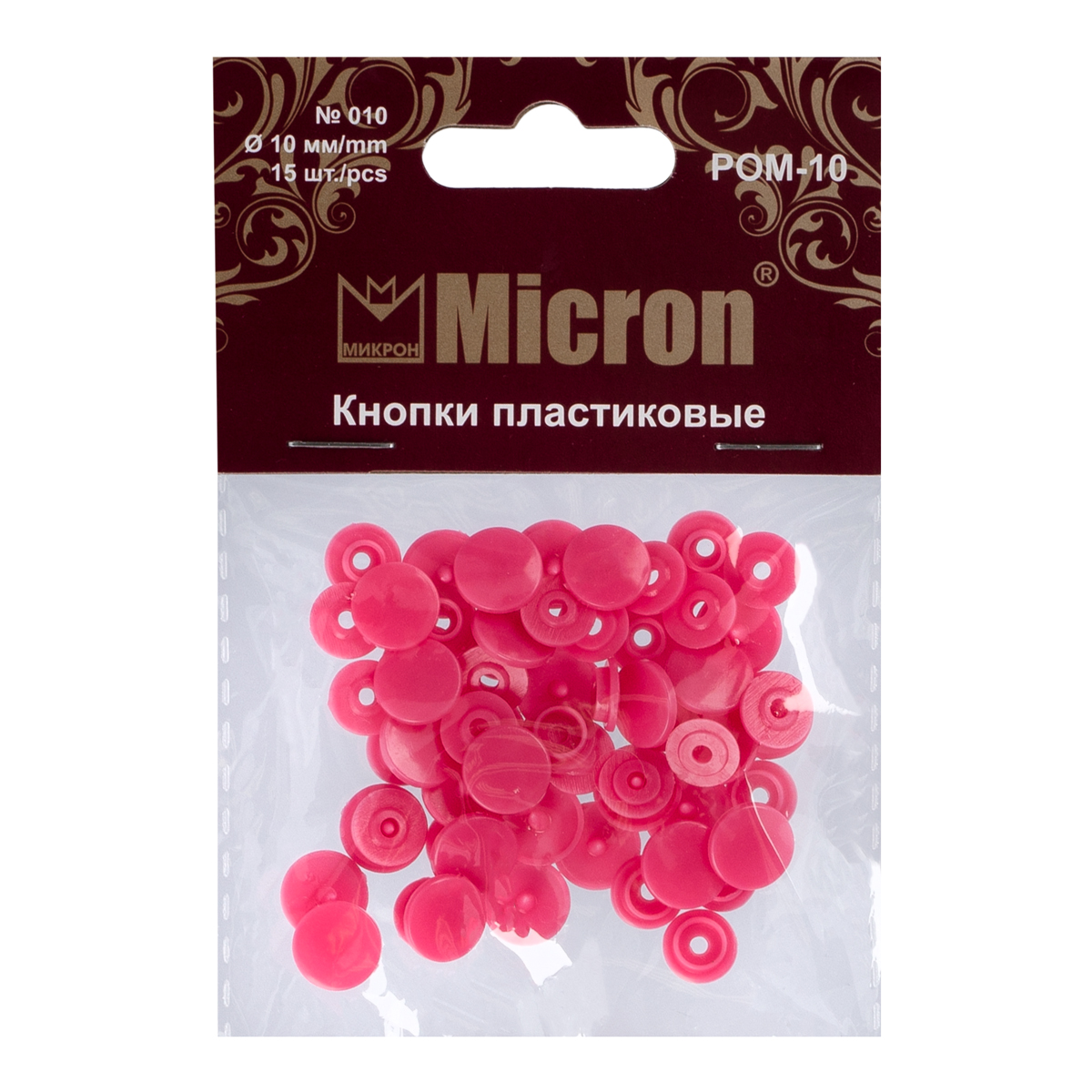 Идеальны для установки на детскую одежду, не вызывают «никелевую» аллергию, возникающую у людей с повышенной чувствительностью кожи при соприкосновении с металлом. Комплект состоит из 4-х деталей: двух лицевых - шляпок со шпеньком и двух внутренних - деталей механизма застегивания/расстегивания кнопки. Застегивание и расстегивание происходит за счет упругости материала самих кнопок. Для установки необходимы Щипцы Micron для пластиковых кнопок арт. POM-10/12/15.