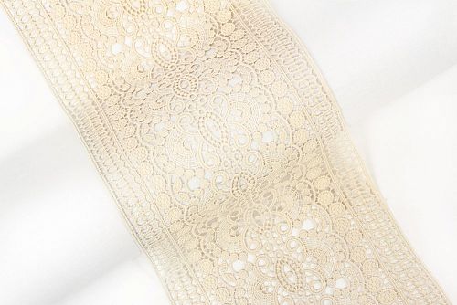 Изысканное, ажурное гипюровое кружево. Имеет широкую область применения: начиная от одежды и свадебных нарядов, заканчивая декором интерьера. Производится в Турции.