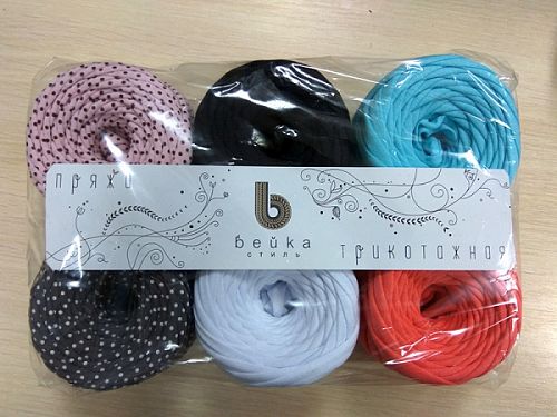 Комплект из 6 мотков. Ширина пряжи 7-9 мм. Пряжа сделана из цельного полотна, без швов и разъединений, без перепадов ширины. Из этой пряжи вяжут коврики, пуфики, корзинки, сумки, клатчи и пр.