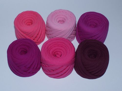 Комплект из 6 мотков. Ширина пряжи 7-9 мм. Пряжа сделана из цельного полотна, без швов и разъединений, без перепадов ширины. Из этой пряжи вяжут коврики, пуфики, корзинки, сумки, клатчи и пр.