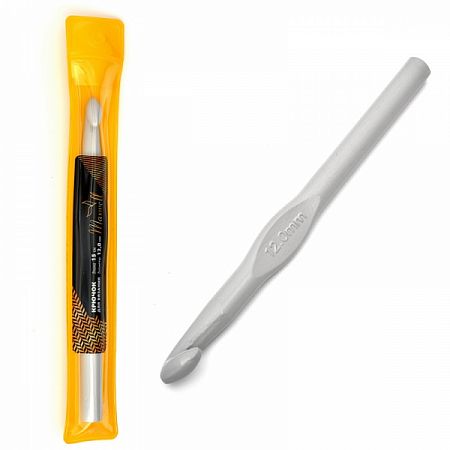 Крючок из алюминия со специальным полимерным покрытием, позволяющим пряже легко скользить по крючку, но не проскальзывать в пальцах рук. Для удобства часть стержня крючка сделана плоской, остриё - округлым, а головка - с канавками.